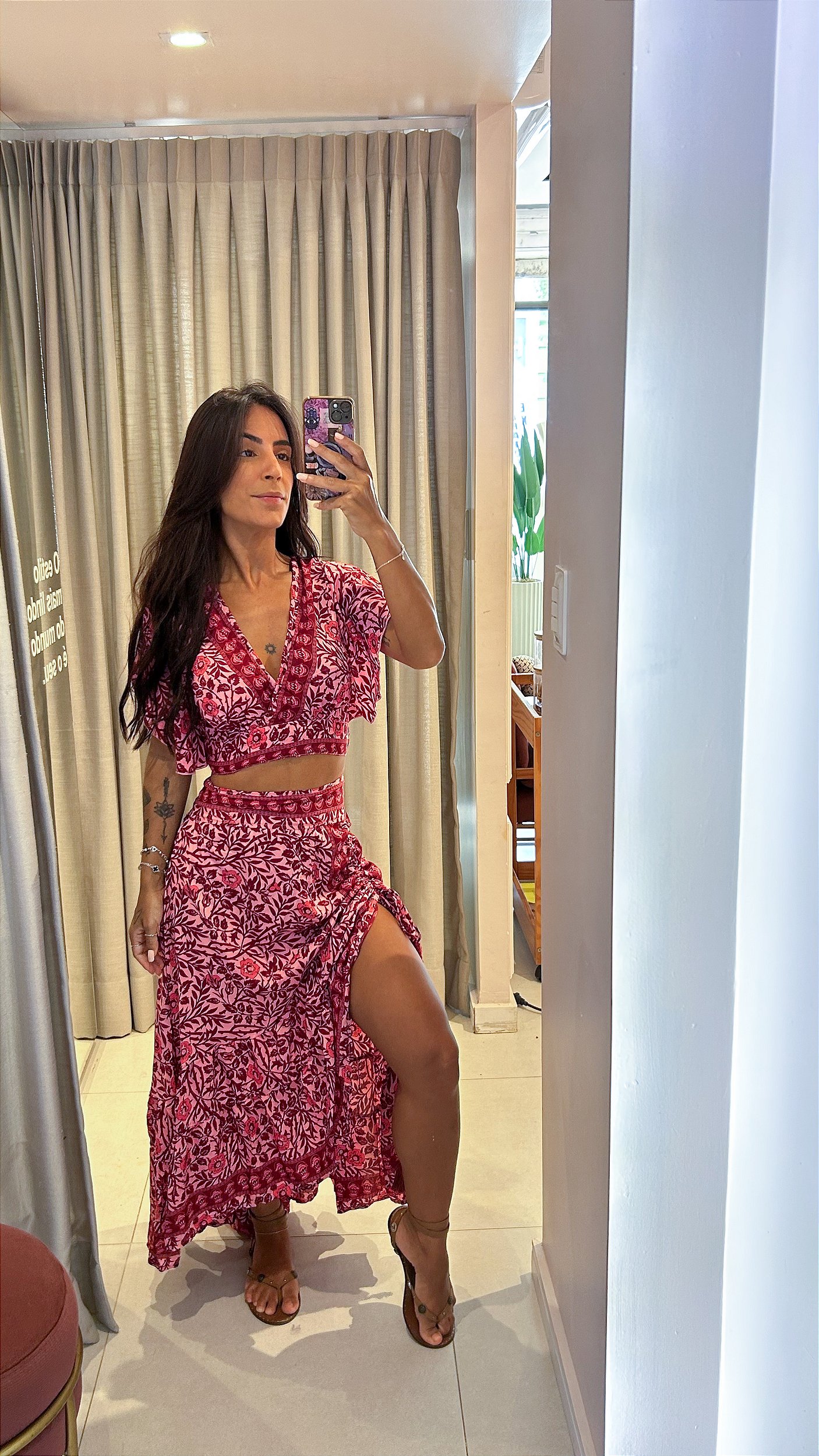 O top complementa o conjunto com um caimento delicado, valorizando a silhueta sem perder a liberdade dos movimentos.