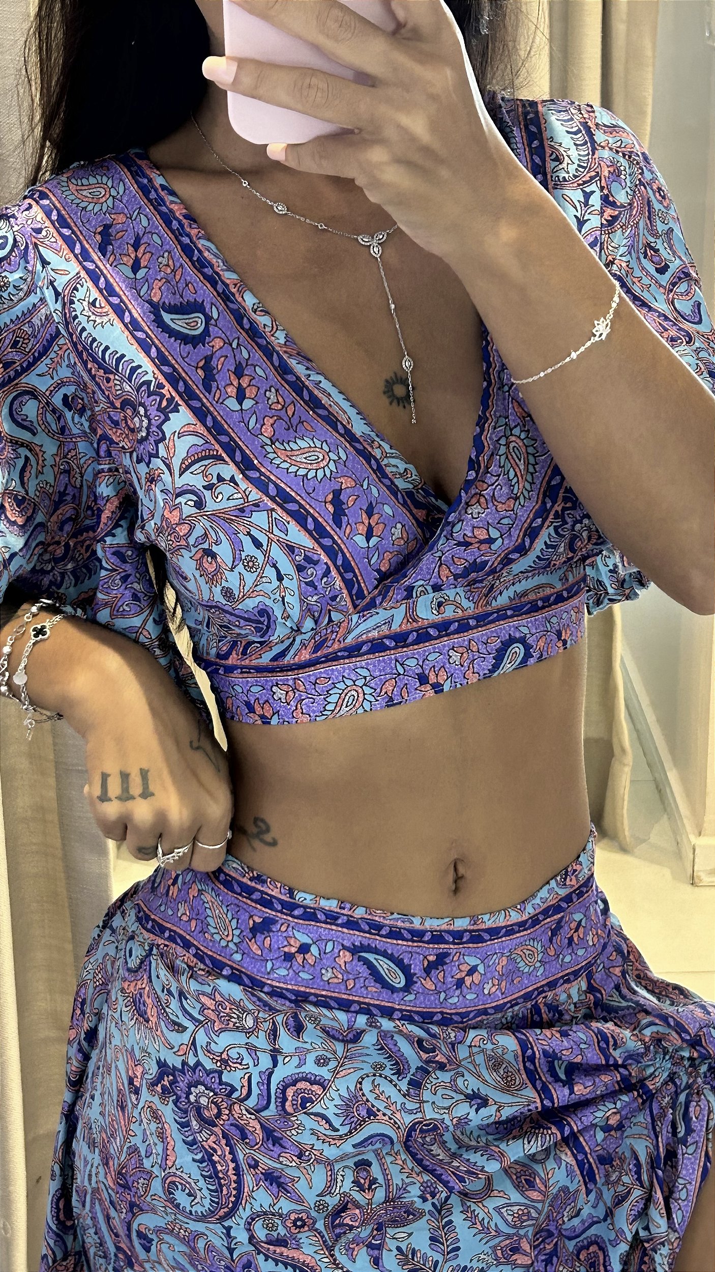 Confeccionado em seda indiana, o Conjunto Oriente carrega leveza, movimento e uma estética mística que atravessa culturas e tempos.