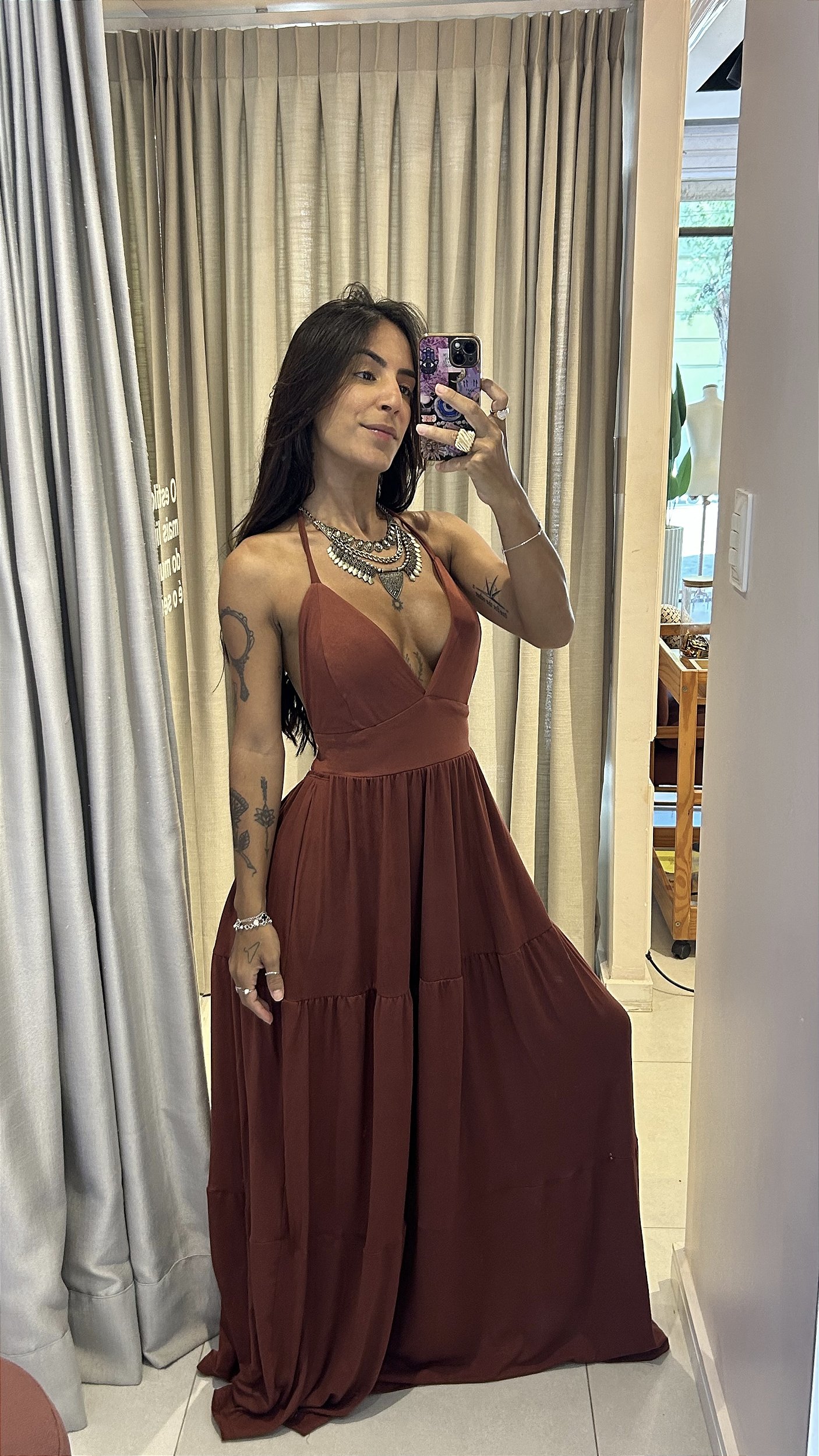 Possui decote valorizado e amarração nas costas, garantindo ajuste confortável e elegante.