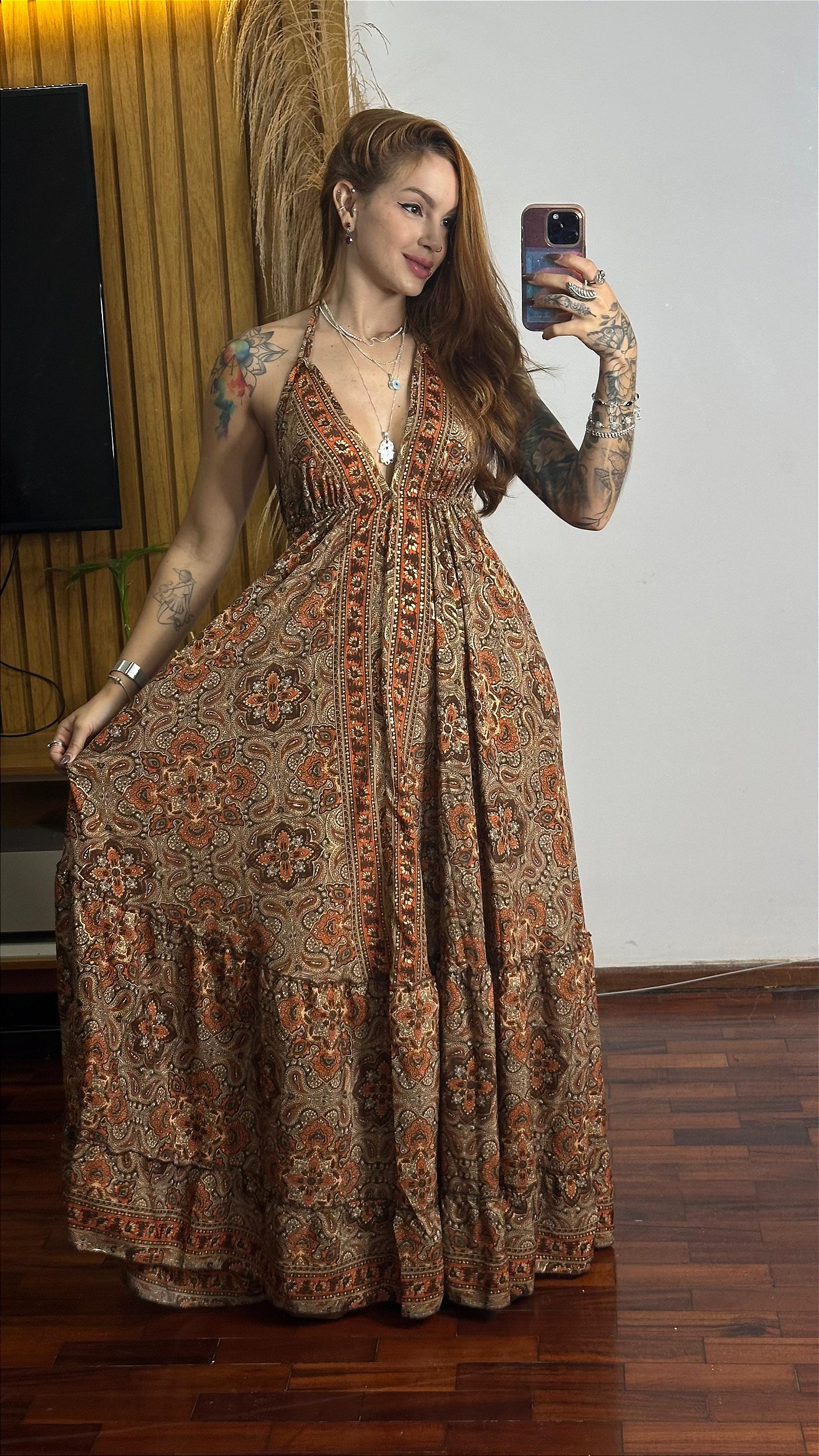 O Vestido Pipa é aquela peça impactante que une leveza, sensualidade e sofisticação em um só look. Confeccionado em seda indiana com delicados fios dourados, ele traz movimento, brilho sutil e um caimento impecável no corpo.